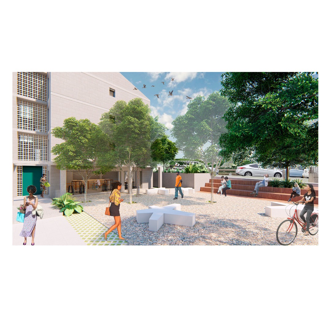 Se plantea la creación de una plaza pública en la intersección vial en la esquina del terreno ya que la misma ha sido clausurada debido a que el nivel de ambas calles tiene una diferencia de 1.50m. Este espacio, que hoy en día está en estado de abandono, esperamos que sirva lugar de encuentro entre los vecinos y de conector con el Conjunto Monumental que hoy en día es limitado con una cerca, dejando al barrio como mero espectador a distancia.