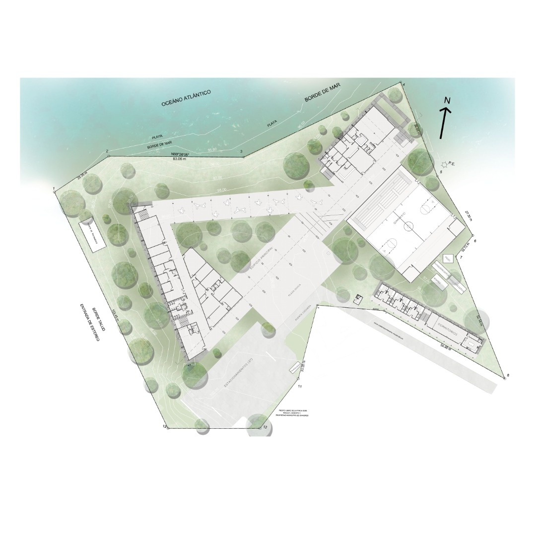 El diseño contempla como una de sus primicias el mantener una relación visual directa con el mar. Para esto, el edificio se eleva para poder ver a través de él hacia el mar al acceder por la plaza cívica. De la misma manera, sus pasillos rematan siempre en vacíos que permiten una visual al paisaje. El proyecto tiene como punto central un patio interno que sirve de ventilación, túnel de viento e iluminación a las zonas comunes del Centro Educativo. Este patio potencia la interacción entre los estudiantes y al mismo tiempo sirve de vínculo entre la plaza cívica, la terraza y el mar.