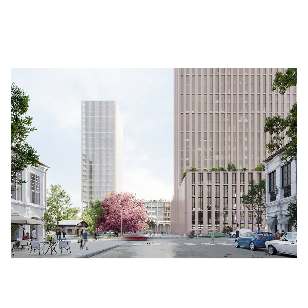 En cuanto al programa, apostamos por un uso mixto en las bases y un programa definido en el volumen superior que busca mantener la vida del lugar como ocurre en el resto de la ciudad. Elementos como Paneles solares, captación de agua para su reutilización, zona de reciclaje y brise soleils.