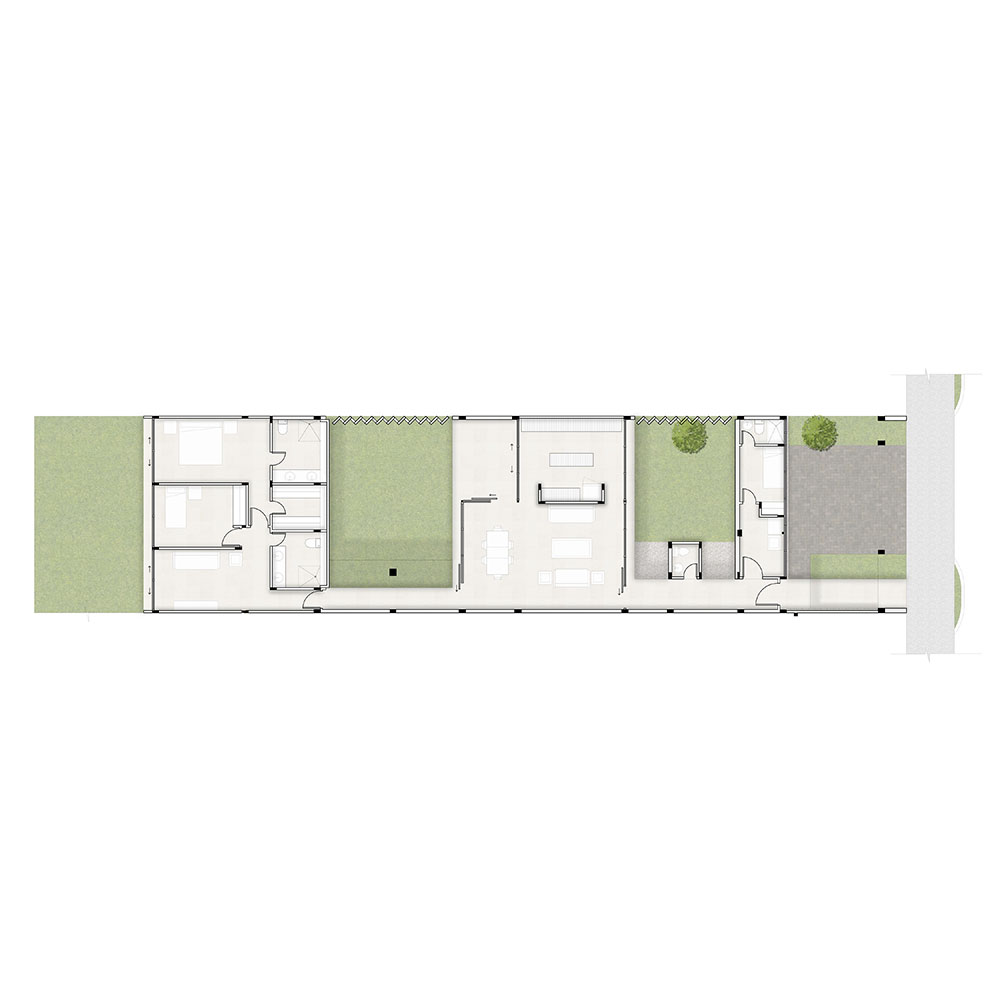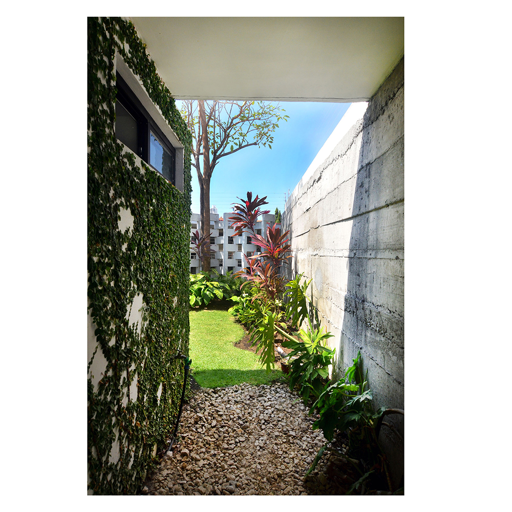 Como solución se diseña “una casa patio” donde cada uno de estos patios separa los 3 usos básicos de la casa de la siguiente manera: servicio/patio/social/patio/recamaras/patio. Con esta configuración se logra iluminación natural en cada uno de los espacios de la vivienda, ventilación cruzada y se diluye la barrera entre el interior y exterior maximizando la calidad espacial.