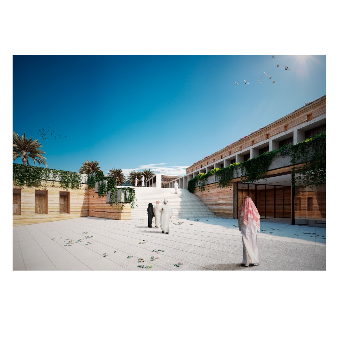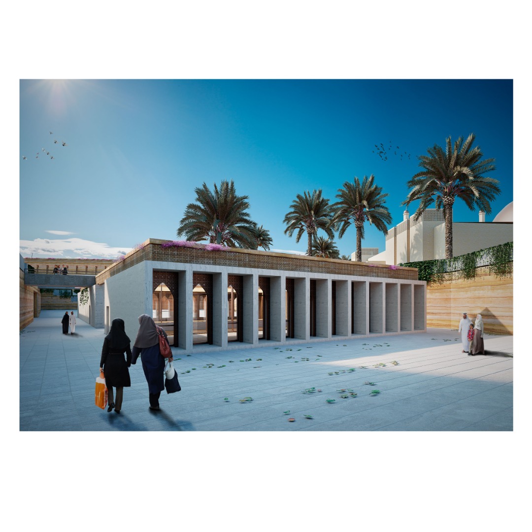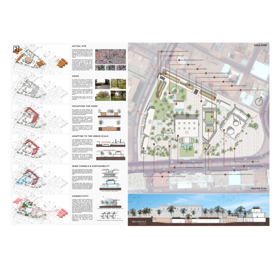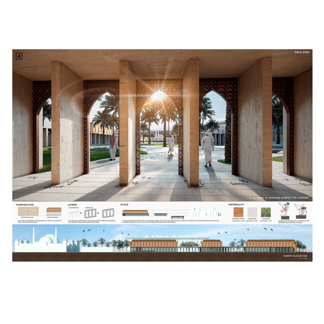 La idea de hacer estos edificios a manera de conexión y otros bajo el nivel de tierra tiene como único fin no robar protagonismo a la biblioteca y mezquita existente. De esta manera, la intervención plantea realzar y mejorar el espacio más que cambiarlo radicalmente.