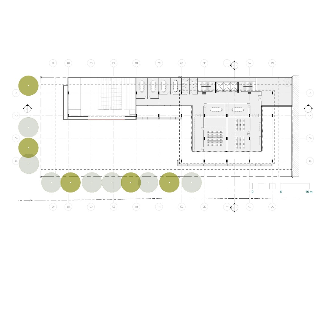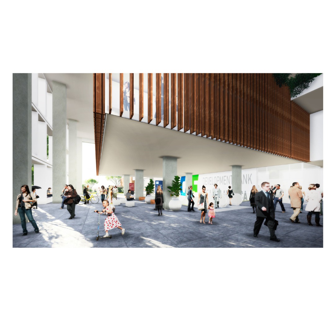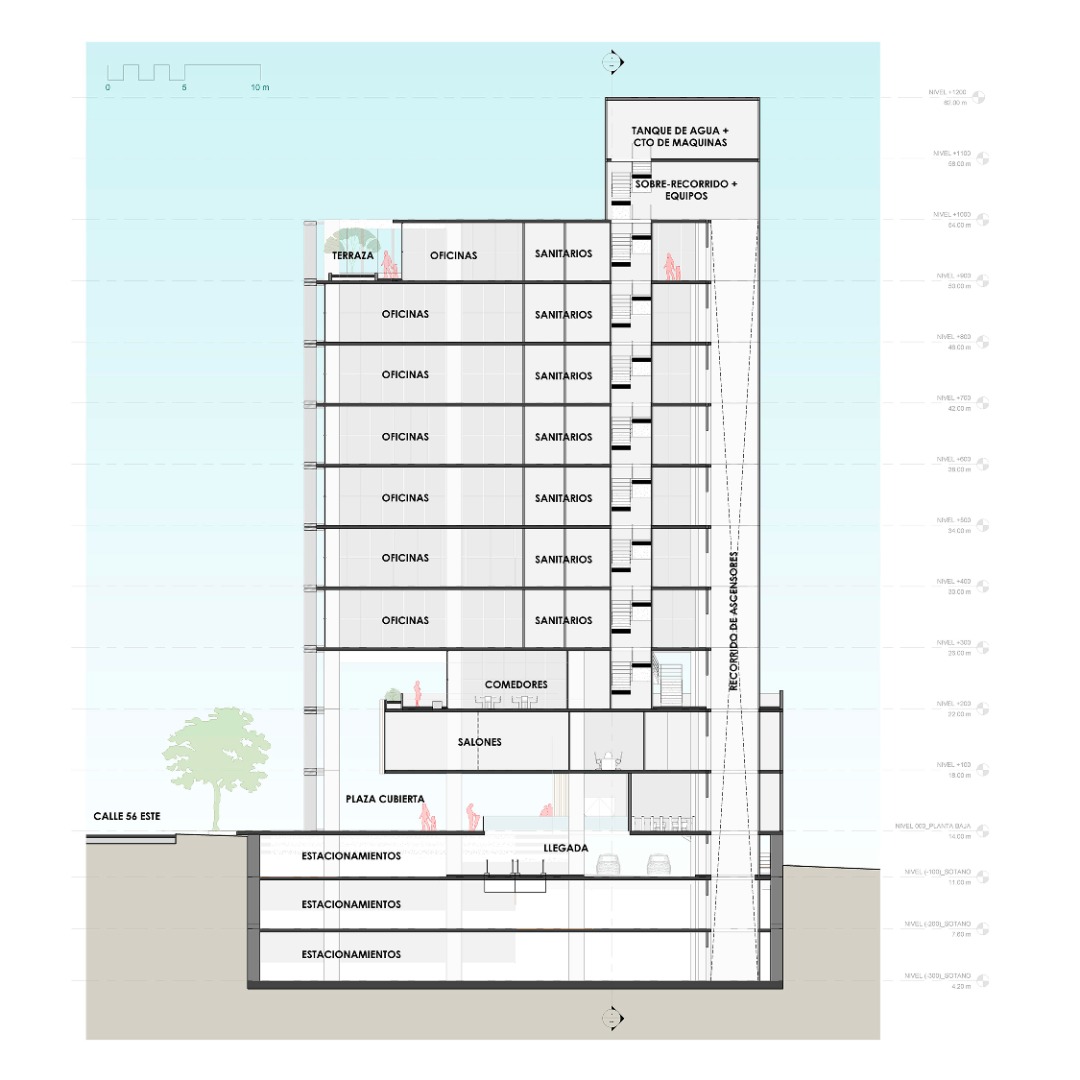 El planteamiento de diseño parte por el espacio público. El edificio se ha retirado hacia los dos linderos del proyecto, de esta manera se da lugar a una plaza pública de 1,850 m² en la esquina del lote, que aprovechando la topografía del lugar va formando espacios más pequeños de intercambio. El 30% de esta plaza está techada por el edificio de oficinas (al SE del lote) que se ha levantado del suelo para liberar espacio público en planta baja. La plaza no es sólo para el público en general, sirve también como área de expansión para la cafetería y la galería de arte, además del auditorio.